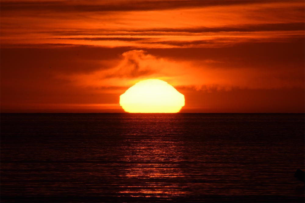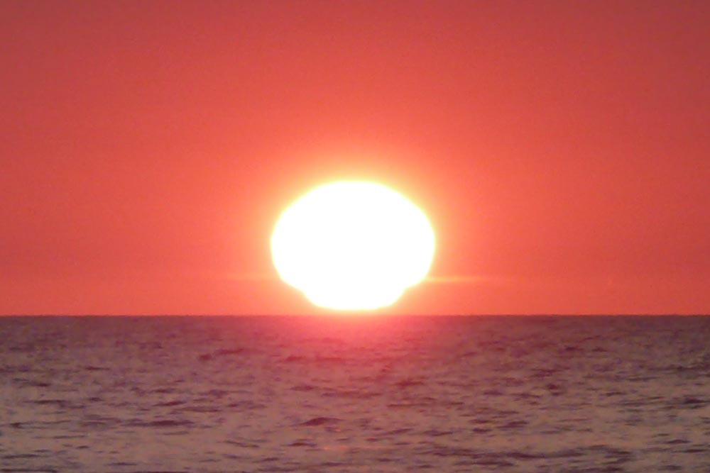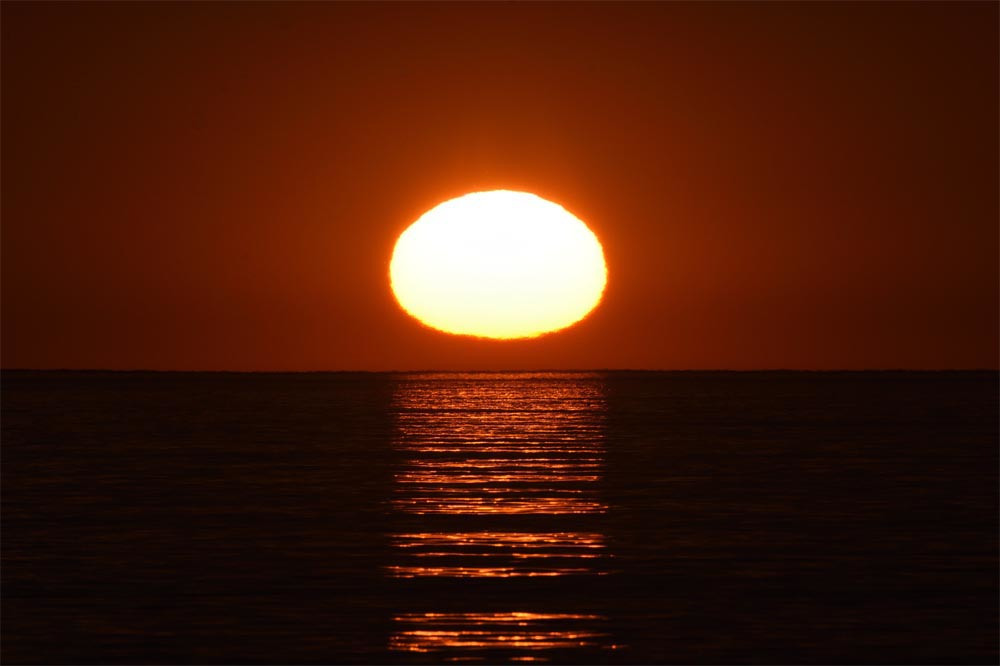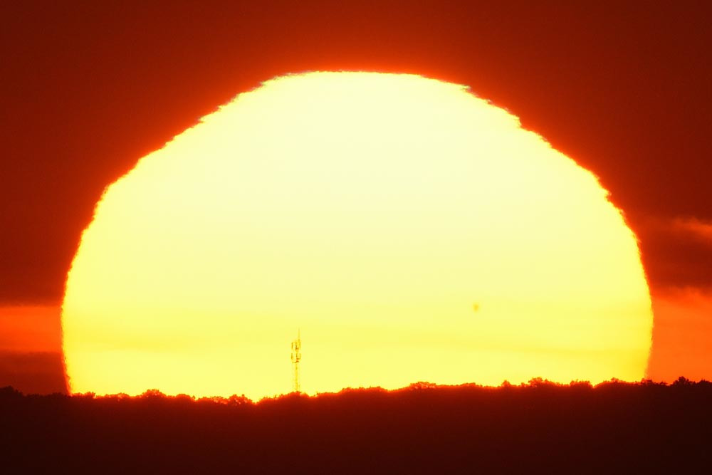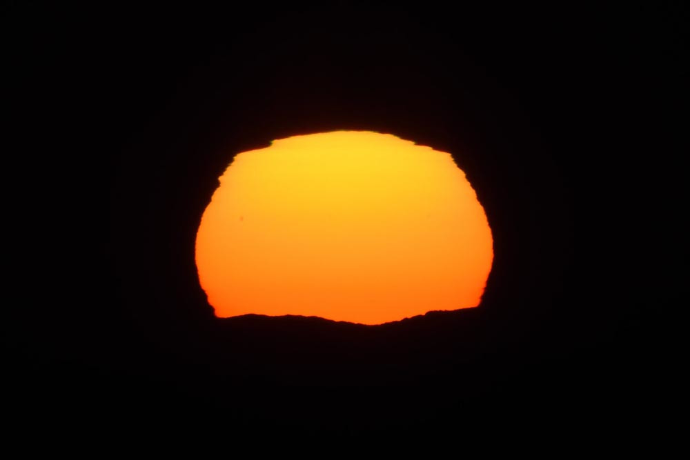 Les images 2.1 et 2.2, réalisées lors d'un même matin d'avril 2022, montrent un aplatissement particulièrement important alors que le Soleil n'est pas encore complètement sorti au-dessus de l'horizon (2.1) et nettement moins intense 1 min 18 sec après (2.2).
