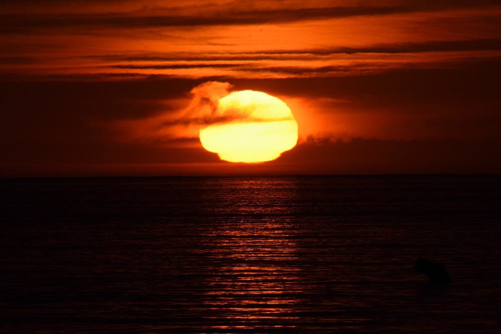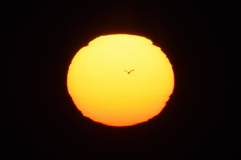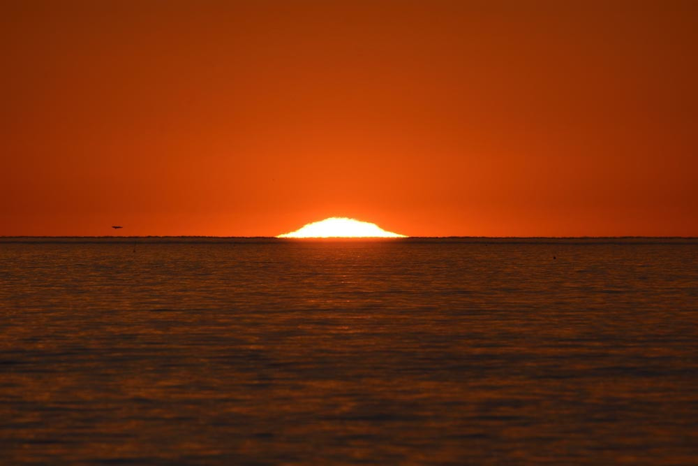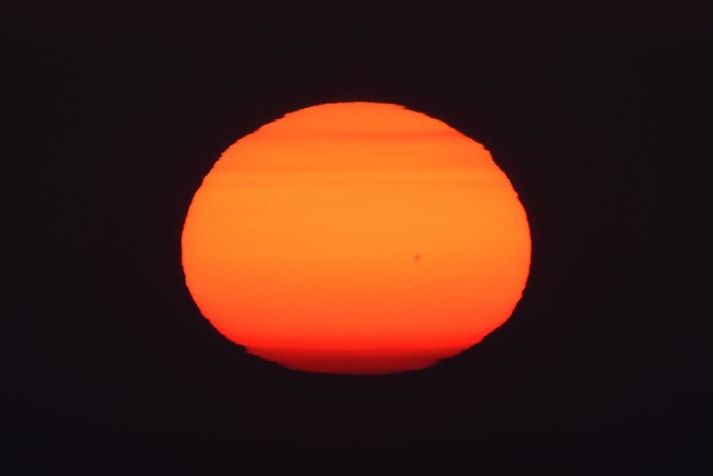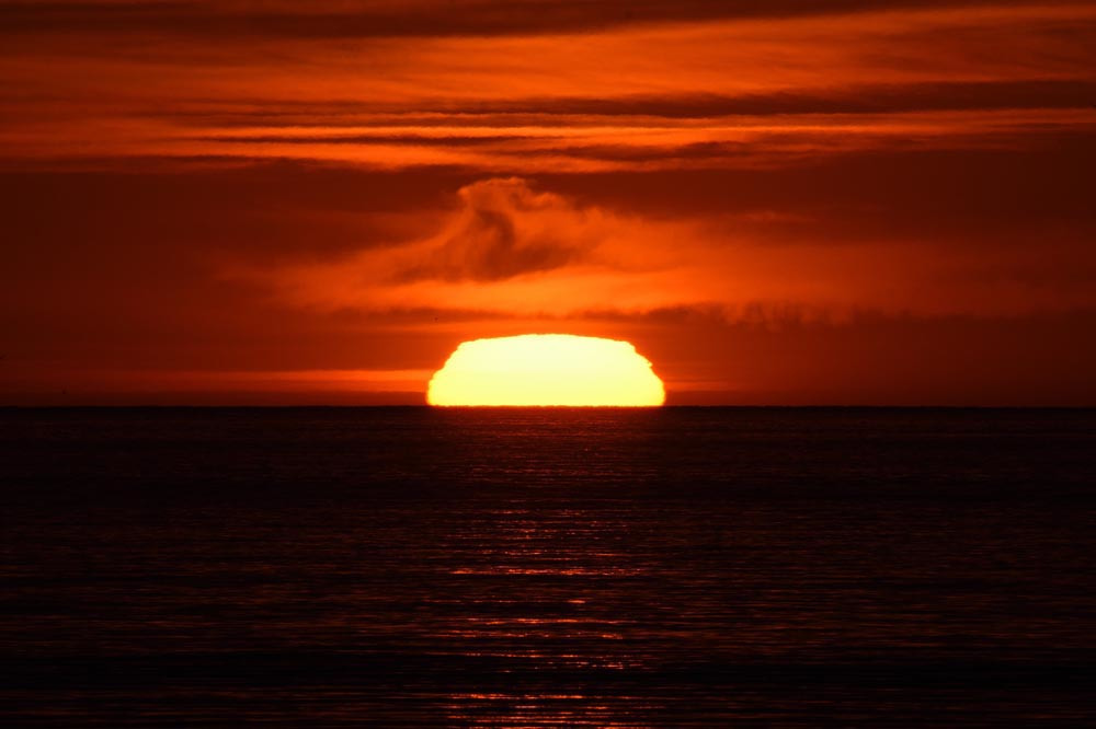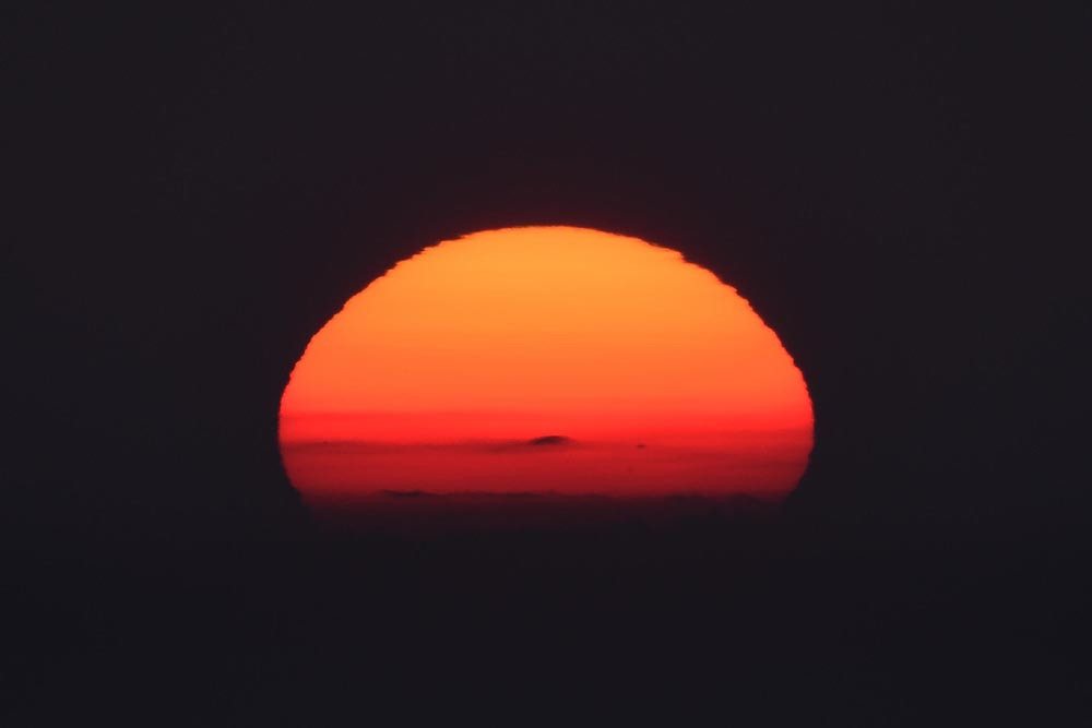 Les images 2.1 et 2.2, réalisées lors d'un même matin d'avril 2022, montrent un aplatissement particulièrement important alors que le Soleil n'est pas encore complètement sorti au-dessus de l'horizon (2.1) et nettement moins intense 1 min 18 sec après (2.2).