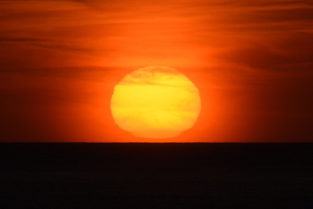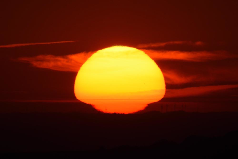 Quand il se trouve très bas sur l'horizon, deux effets atmosphériques affectent le Soleil : son rougissement et sa compression verticale. C'est la conséquence, respectivement, de la diffusion de la lumière, et de la réfraction des rayons lumineux.