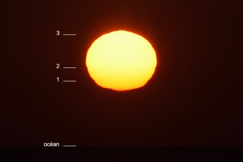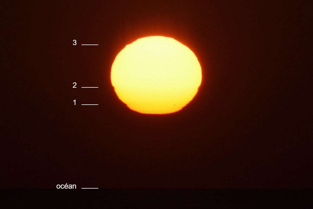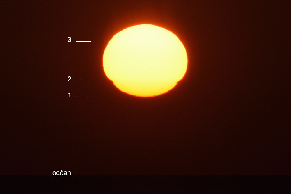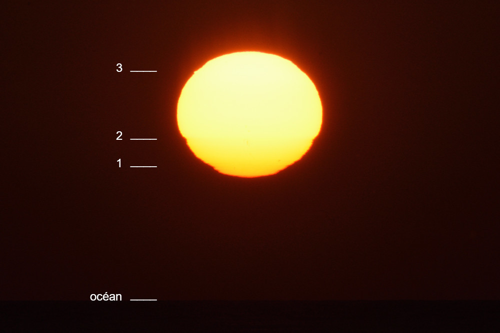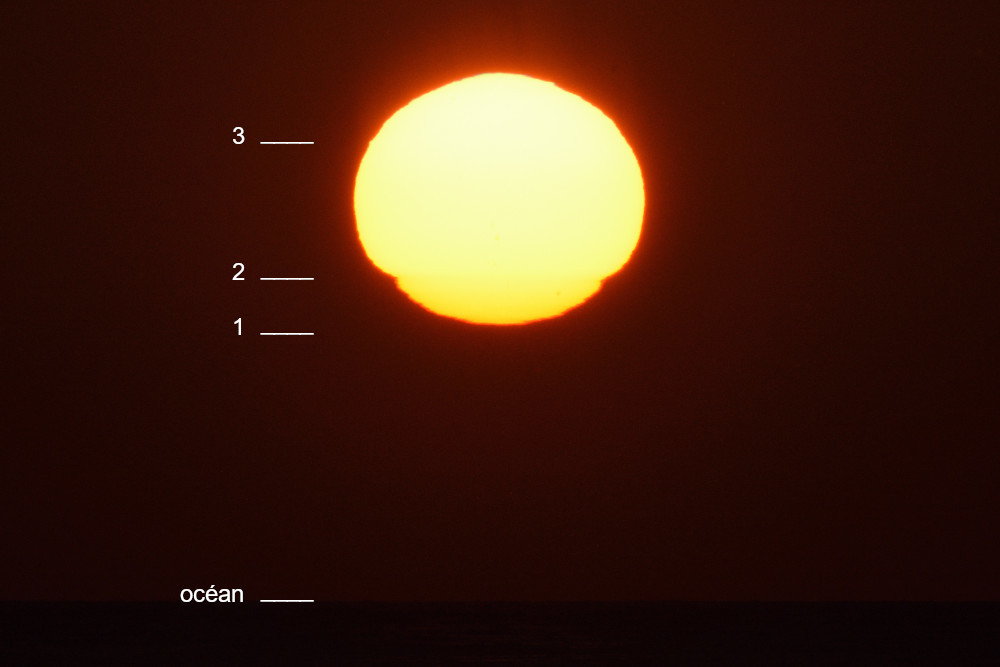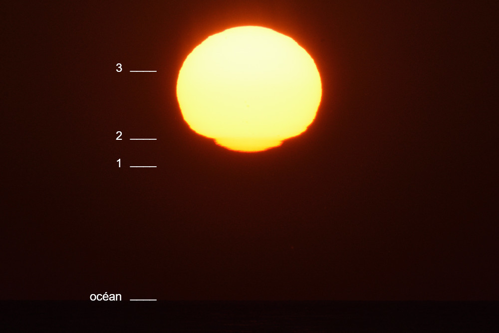 Quand, à une certaine altitude dans l'atmosphère, l'indice de réfraction varie brusquement, il en résulte une perturbation de la régularité du limbe solaire et on observe un contour en "marche d'escalier" comme dans l'image 1.5. C'est aussi le cas des images 4.1 à 4.6 réalisées en avril 2025 à Anglet dans les Pyrénées-Atlantiques, où trois niveaux de variation importante de l'indice de réfraction sont numérotés de 1 à 3 ; le niveau de l'Océan Atlantique est aussi indiqué car il n'est discernable que très faiblement. 53 secondes se sont écoulées entre la première et la dernière image.